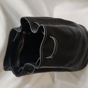 vintage pebble leather, drawstring closure, bucket bag, backpack, shoulder bag. for sure a collectors item. this bag has aged well! spacious interior with zipper pocket. item shows signs of use and area of discoloration and markings to the item as pictured. item has been in storage so cleaning is recommended. please see all pictures that include measurements
