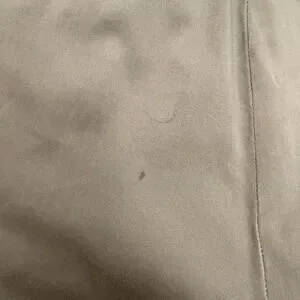 These pants have one spot of discoloration on the back, and is very light. This is pictured.