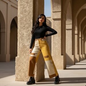 Stylish colorblock wide-leg pants featuring a blend of yellow, cream, and brown. Perfect for a bold fashion statement.
