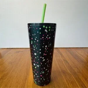 This 24 oz Starbucks tumbler features a confetti design with a secure lid and reusable green straw. Ideal for cold beverages.