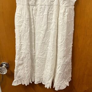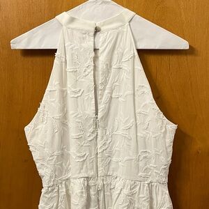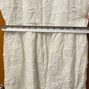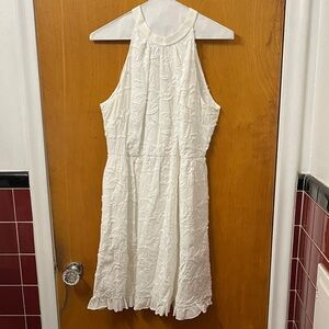 Chic white mini dress with textured fabric. Sleeveless design. Perfect for stylish outings. Has pockets!