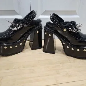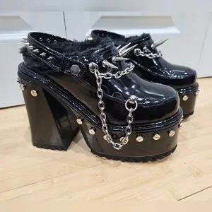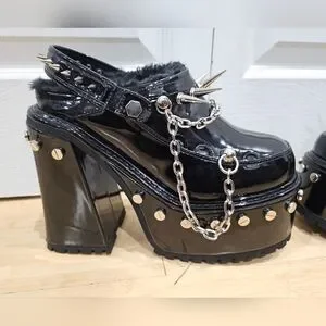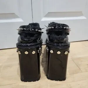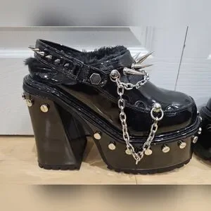 cuz you’re a badass with a cause. These platform mules have a patent vegan leather construction, a faux fur trim, and all over metal spike and chain detail,