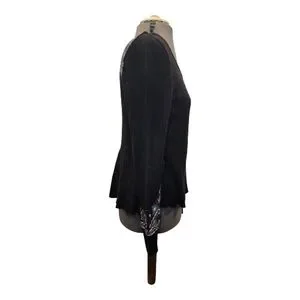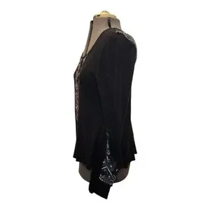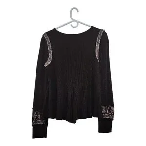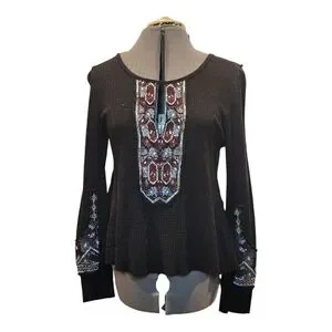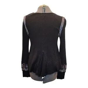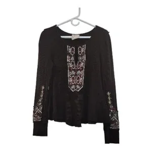 Free People Marion Black and Burgundy Embroidered Thermal Long Sleeve Top Large