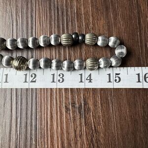 One is made of silver or gray satiny silk wrapped beads with a Magnesite cross pendant and some faux magnesite beads. These were popular in the 60s. It is 31 long