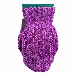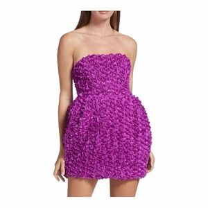 Brand new with tags Rotate Birger Christensen strapless mini dress in a vibrant purple hue. Features a fully textured 3D floral fabrication with a sculptural, voluminous silhouette that creates a dramatic, statement-making shape. Structured strapless neckline with a fitted bodice and bubble-style skirt. Fully lined for comfort and structure.