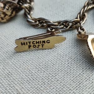 7.5" gold tone heavy solid charm bracelet with whimsical castle themed charms. One says "superstition " , the other "hitching post" and another "San Xavier".
