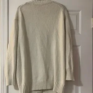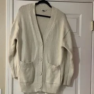 Cozy off-white cardigan with button closure. Features front pockets. Perfect for layering.