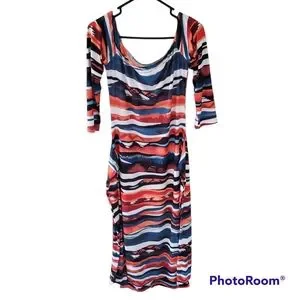 Muriell's Closet multiprint knit dress. White, blue, orange. Fits like a large. Polyester & Spandex blend.