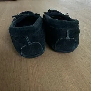 Nice suede leather moccasins. They have fringe and a cute bow on the toe. Also they have hard soles so you can wear them outside. Comfort and practicality.