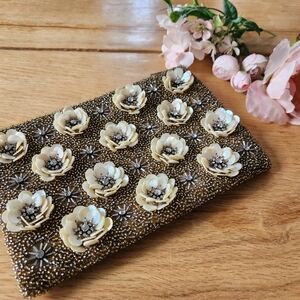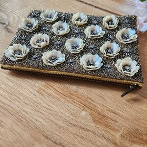 Anthropologie White Floral Beaded Evening Clutch Purse Shell Flowers