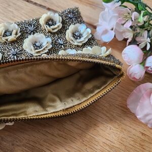 This Anthropologie floral beaded clutch is in excellent pre-owned condition. Both sides are covered in glass, crystal, and mother of pearl shell beads. It has a very vintage look and would be excellent for a wedding clutch or formal party. The purse is linned with satin. It measures 9" x 6". Please note in the last photo the anthropologie tag. This is a screenshot to show authenticity and is not the bag for sale.