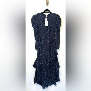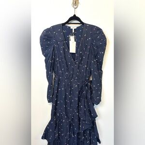 NWT Joie Miralay Ruffled Wrap Dress Size XS Navy Blue Firefly Puff Sleeve Midi