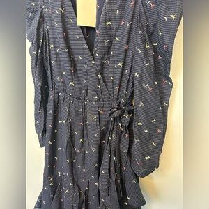 For sale we have a new with tags Joie navy blue firefly dragonfly printed ruffled puff sleeve midi dress size XS. Faux wrap bodice. Asymmetrical hem. Gorgeous piece!
