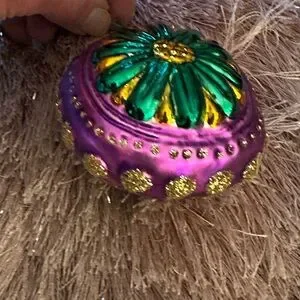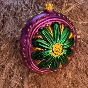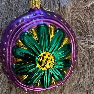 Vibrant purple and green ornament with a floral design. Features gold accents. I think this is another Christopher Radko ornament from my collection
