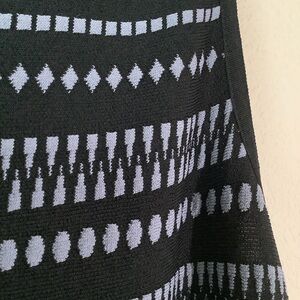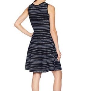 Chic and versatile NIC + ZOE sleeveless fit and flare sweater dress featuring a geometric stripe print. It features a jacquard double-knit construction that can be worn inside-out, letting you switch between two distinct colors or patterns effortlessly. Midi length flatters the silhouette, perfect for work, travel, or casual outings. Knit fabric offers comfortable stretch and an effortlessly polished look.
