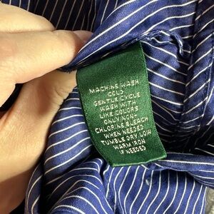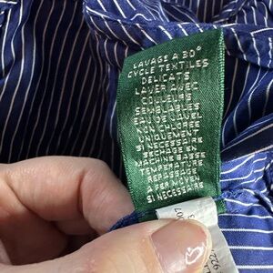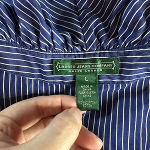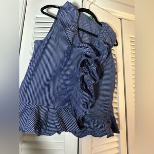 Chic navy blouse with elegant ruffles. Features stylish stripes. Sleeveless design for versatile wear.