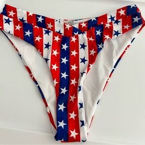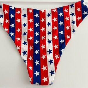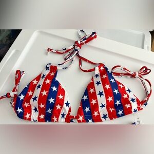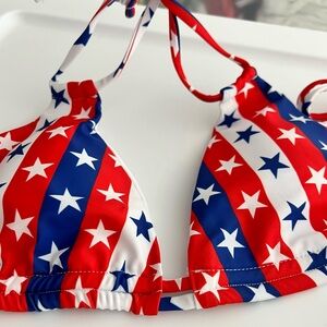 bikini, perfect for making a splash at pool parties or beach outings. The star-spangled pattern and American flag theme add a festive touch, while the quick-drying polyester and elastane blend ensures comfort and ease. The triangle swim top with a halter strap offers an adjustable fit, making it ideal for sun-soaked days. Whether you're lounging by the water or enjoying a summer barbecue, this multicolor two-piece is your go-to for a stylish, spirited look. Condition: New.
