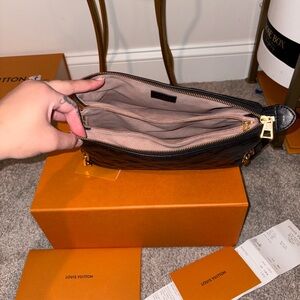 Bought this from the Louis Vuitton store. It’s in great shape. I have so many other colors. It’s time to get rid of this after a year or so…. I will miss it dearly, but I hope it’ll add that special touch to your wardrobe or become a staple piece in your closet! I do have the original receipt. You will receive the purse just like you see in the photos. The Crossbody strap. The gold chain strap as well. If you’d like the box, I can send it with the original box. It also comes with all dust bags, authenticity cards, care, cards, receipt, etc.. no stains inside, immaculate condition, no tears in the leather, no defects. Like new. Normal wear and tear. You’ll love it! Used a handful of times.