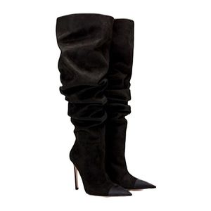these stunning over-the-knee boots feature a sleek suede finish with a slouchy design & pointed toe for a bold, sophisticated look. perfect for dressing up any outfit!