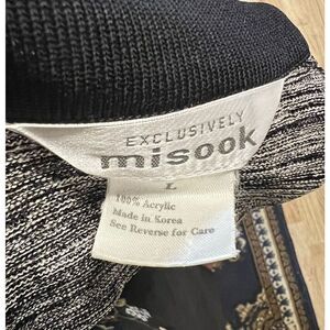 Here's a very nice, newer cardigan from Misook! This has a striped, mottled gray background with black trim all the way around. There are hook and eye closures and small side slits. This is a textural knit with a bit of weight to it, perfect for the cooler months ahead! Machine wash or hand wash. Tumble dry. The condition is gently used, with no visible flaws. The label shows some wear, as most Misook labels do. Measurements are taken flat, unstretched, then doubled, and are as follows: