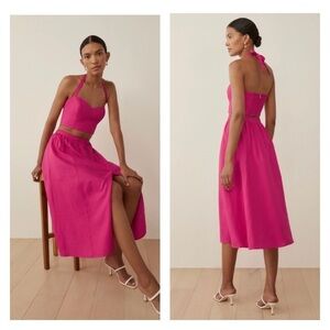 NWT REFORMATION Orzo Linen Sleeveless Two Piece Crop Top Skirt Set Midi Dress Hot Pink Barbie Pink