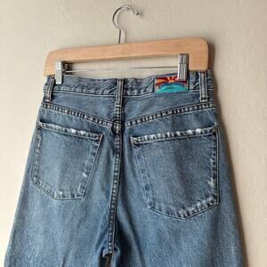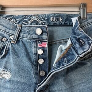 Daily Blue "Hype" denim jeans in the Tempest shade with a distressed + ripped straight leg. Rainbow sunrise embroidered patch at back. Classic cropped length. Medium wash. 5-pocket styling. Button fly closure. High rise. 100% cotton. Made in USA. Size 26.