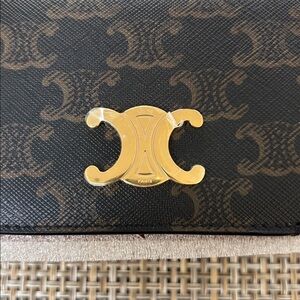 Celine compact wallet with iconic monogram pattern. Features gold emblem. Snap closure. Credit card slots. Zippered coin purse