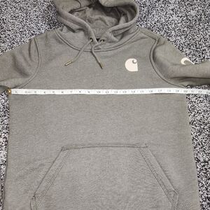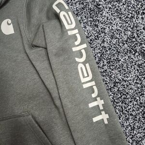 The Carhartt Relaxed Fit Army Green Sage hoodie is a warm and versatile pullover designed specifically for women in size XS. It features a relaxed fit for added comfort. The hoodie is accented with the Carhartt logo, adding a stylish touch to the classic green color. This hoodie is perfect for outdoor activities or casual everyday wear, offering both style and functionality.