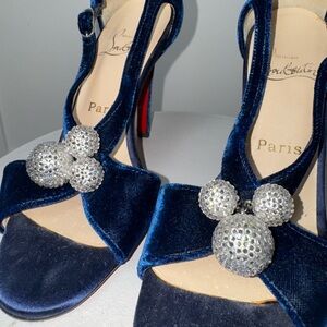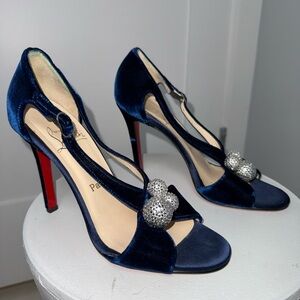 Christian Louboutin heels, Louboutin velvet heels, navy velvet sandals, crystal embellished heels, evening heels, luxury designer shoes, special occasion heels