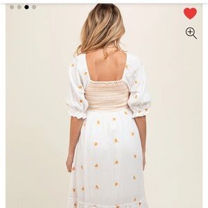 Chic and comfortable, this white dress features delicate yellow embroidery. Perfect for any occasion. Worn once for newborn session