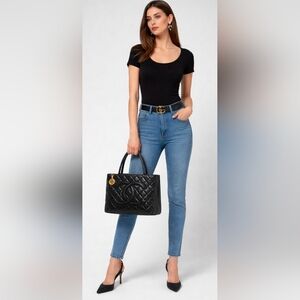 Chic Chanel tote in black quilted leather. Features iconic logo and gold charm. Perfect for any occasion.