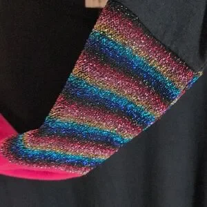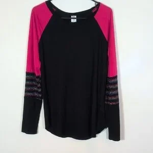 Chic long sleeve tee with vibrant pink accents. Features colorful striped sleeves. Ideal for casual wear.