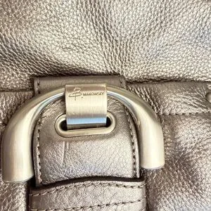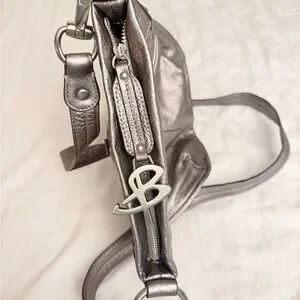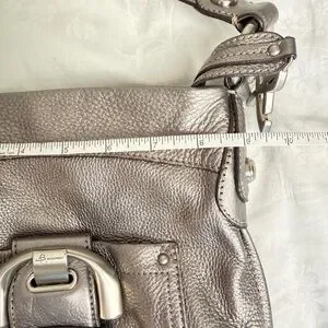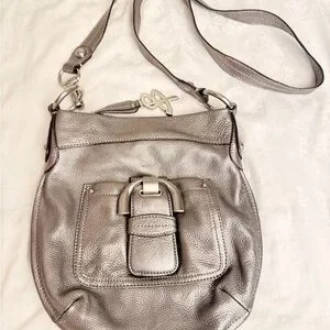 Chic metallic silver crossbody bag by B. Makowsky. Features a stylish buckle detail. Perfect for versatile wear.