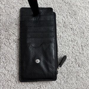 Sleek black leather card holder wallet. Features multiple card slots and a secure snap closure.