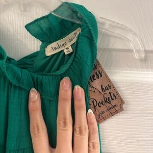 Chic green midi dress with halter neckline. Flowy and stylish for any event. Has pockets and it can fit up to size L . Double lined. Pretty bow in the back