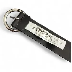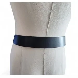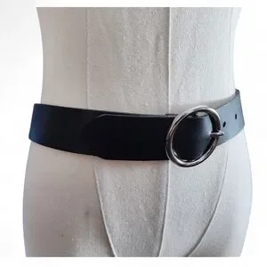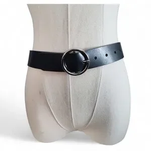 Black faux leather belt with round buckle. Buckle comes in silver for contrast and shine, and the adjustable design lets you find a secure fit.