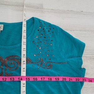 Teal short-sleeve top with decorative embellishments. Features intricate design on the front. Comfortable and stylish.