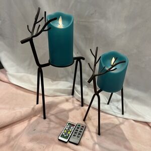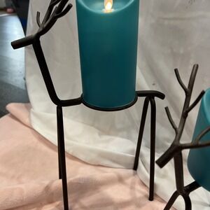 2 Reindeer Candle Holders Standing Iron Metal with flames less remote candles