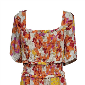 This stunning orange sundress features a square neckline and short puff sleeves, perfect for a wedding guest. The flowing maxi length and defined waistline create an elegant silhouette, while the light, airy fabric ensures comfort and style for any occasion.