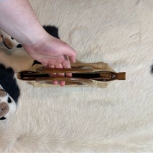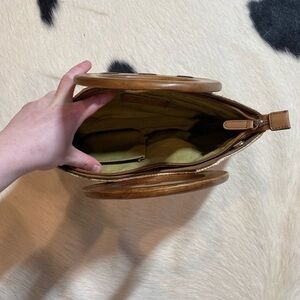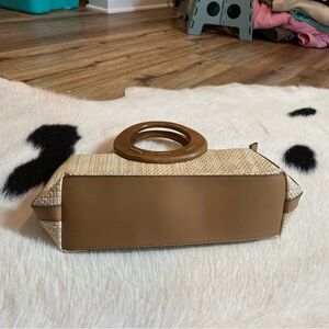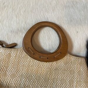 woven or straw-like handbag with a circular wooden handle. It has a light tan or natural color with a darker brown trim and handle. The bag seems to have a rectangular shape with rounded edges and a zip closure. Open to offers and bundle items to save!