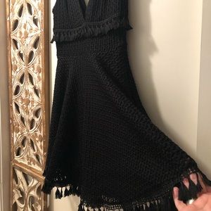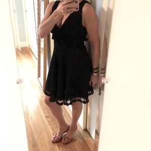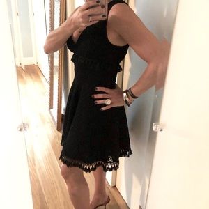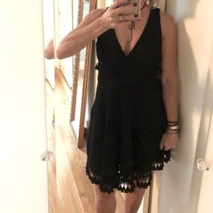 Do date night right in the Ali & Jay Kiss Me in the Candlelight Black Lace Dress! A crochet lace overlay shapes a plunging surplice neck and back, and fitted waist with fun, tassel accents. Full skater skirt with more tassels on the hem completes this flirty style. Hidden side zipper.