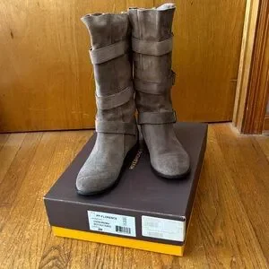 Worn a handful of times, in EUC! Hive & Honey Florence boots in cocoa brown oily calf suede actually read more towards a taupe, light brown color. Pull on style with triple buckle accents. 1” heel. Perfect for any occasion, these boots offer both comfort and style. Size 8