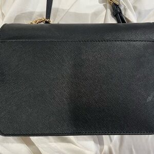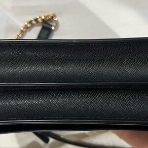 Chic black crossbody with gold chain accent. Perfect for day or night.