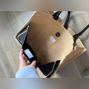 Elevate your weekend style with this chic tan and black tote bag. Perfect for casual outings, this bag combines fashion and functionality. Straw outer with a pvc like lining inside. Front Velcro closure pocket.