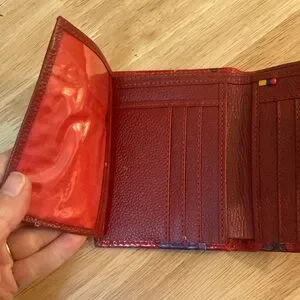 This wallet is beautiful!! Stylish wallet with a vibrant floral pattern. Features red, pink, and yellow colors.