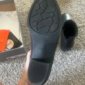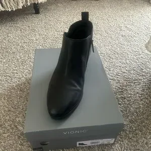 Elegant black leather booties by Vionic. Sleek design with side zipper. Ideal for versatile styling.