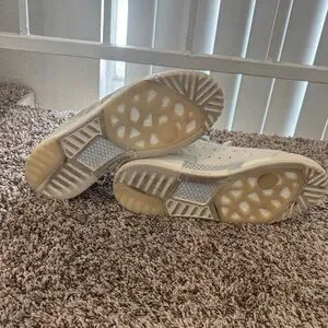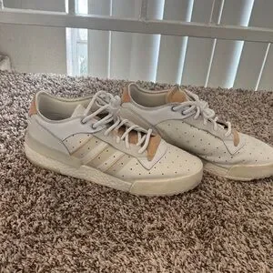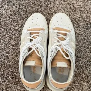 Stylish adidas sneakers. White leather with tan accents. Comfortable and trendy. No original box Work 1-2 times