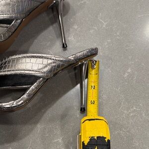 Chic silver heels with croc-embossed design. Perfect for stylish evenings. Would make beautiful holiday shoes! Or New Year’s Eve!
