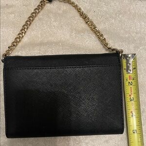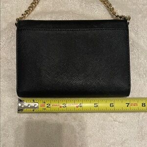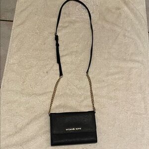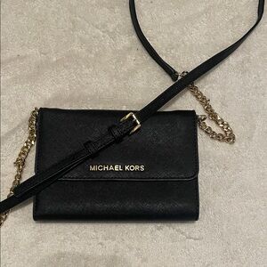 Micheal Kors jet set phone crossbody Saffiano leather bag. This Michael Kors Jet Set Travel Phone Wallet Crossbody Clutch is a stylish and functional accessory for any woman on the go. Made of high-quality black leather with a coated finish, this bag features a snap closure and a detachable strap for versatile wear. The bag has a variety of compartments and pockets, including inner dividers, outer pockets, and a convertible design. It also comes with a bag charm and gold hardware.