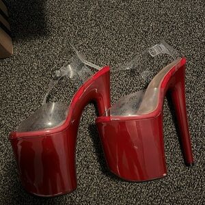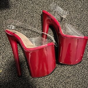 Worn not more than 3 times. Some scuffs. Bottom tread is like new. Chili is the color. 8’ sandals platform. Size 6 US